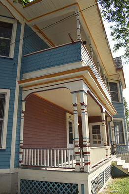 This unique double porched home was built around 1900. We purchased the property in 2011, and gave the building a full renovation. It features two 1-bedroom units, one with a unique glazed-tile fireplace, as well as an over-sized 2-bedroom on the second floor with a bonus room, and sizable upper porch. Hardwood floors, bay windows, and brand new kitchens and bathrooms are found throughout the house. On the outside, the house underwent a dramatic transformation, from a pale monochrome green to a decorative Painted Lady welcoming you to Euclid Avenue. Additional amenities and utilities at this building include laundry in each unit, water, sewer, and trash collection.