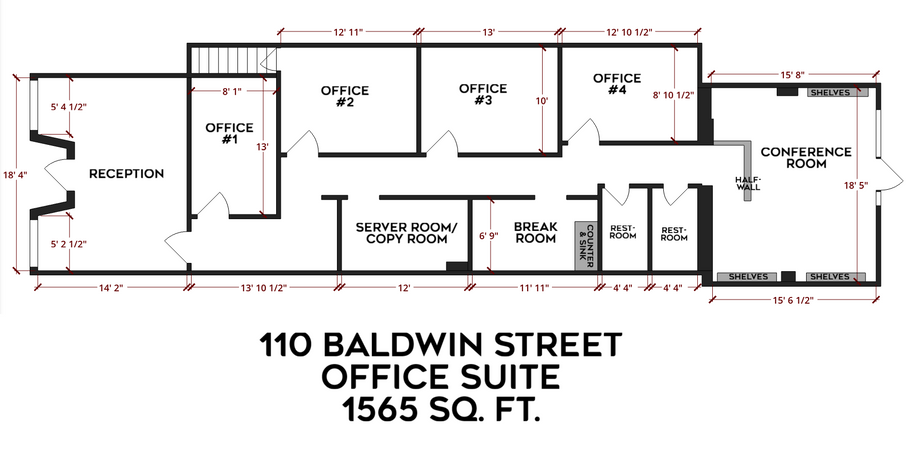 Large office suite with storefront entry, available now! This recently renovated space in the heart of Downtown Elmira even has direct access into the Eastowne Parking Garage, via the suite's rear conference room. The front reception room features a historic tin ceiling and large windows that illuminate the space. A central hallway then leads to 3 private offices, a server room/copy room, a break room with kitchenette, two restrooms, and the conference room with ample shelving space. The space also includes basement access for additional storage. Rent is $1250 + gas & electric; with water, sewer, & trash collection included in the rent.